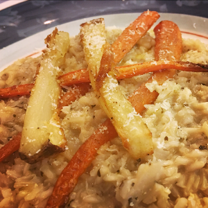 This risotto dinner combines the hearty flavors of roasted potatoes and carrots with rich, creamy brown rice.